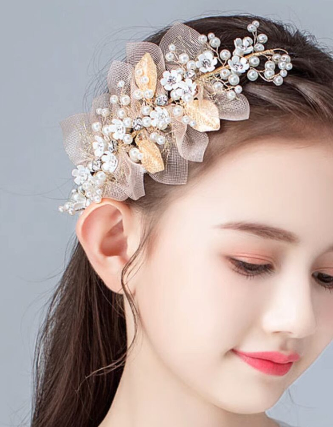 キラキラ輝くパールと可愛らしいお花がアクセントのヘアアクセサリー、Hair accessory kids hat-001。子供たちの髪型を彩り、さらにおしゃれ度をアップさせてくれるアイテムです。お子様がお出かけする際やイベントで活躍すること間違いなし!揺れる度に輝くパールが、まるでおとぎ話の中から飛び出してきたような魔法の一品です。