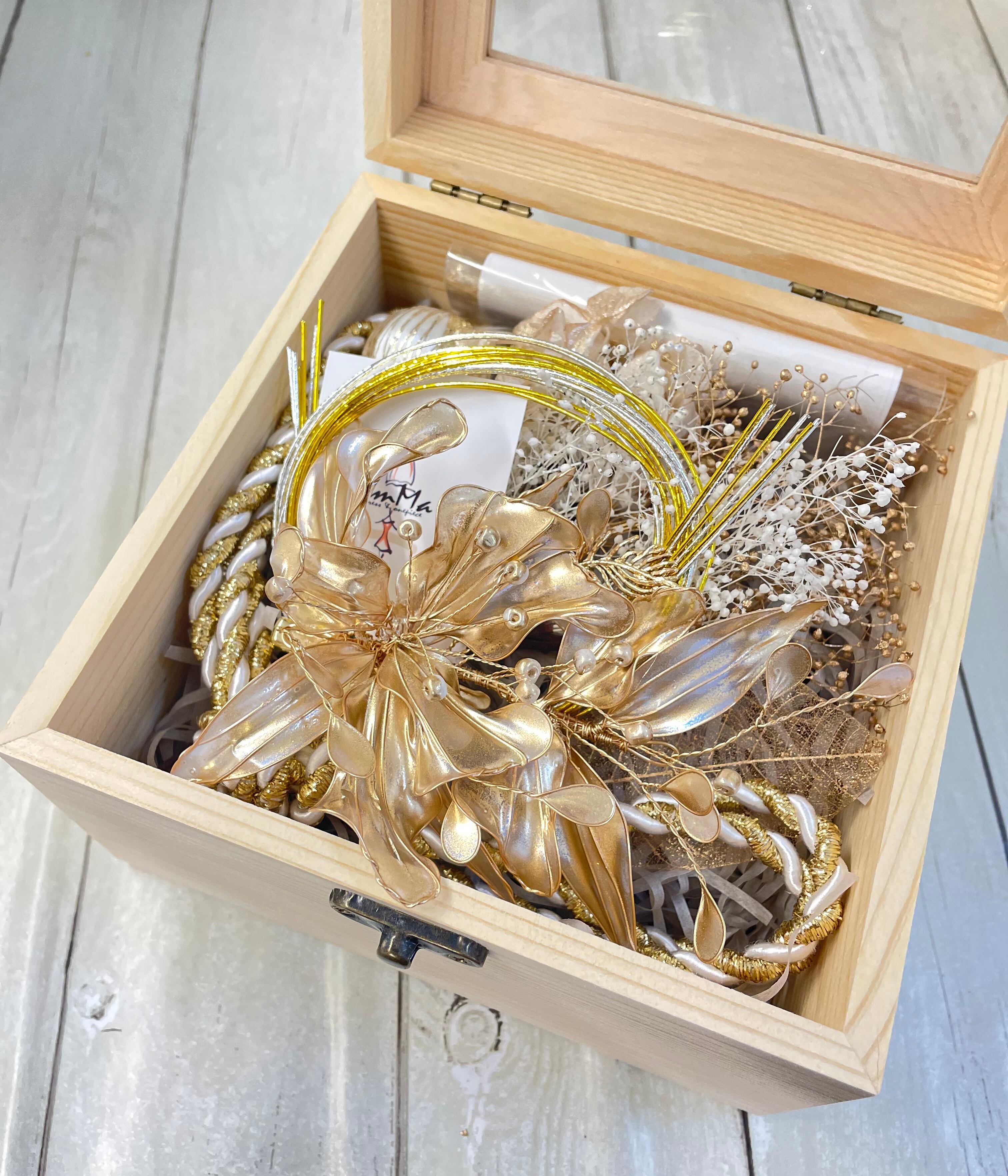 金箔(イミテーション)シートは非常に薄く繊細なため、配送の際はお花の下のBOX一番底にお入れします。ひび割れなど起こる場合がございますが使用には問題ございませんので、ご了承ください。