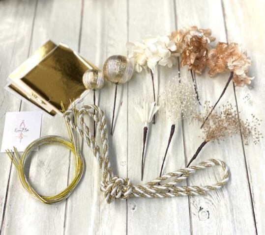 金箔(イミテーション)シートは非常に薄く繊細なため、配送の際はお花の下のBOX一番底にお入れします。ひび割れなど起こる場合がございますが使用には問題ございませんので、ご了承ください。